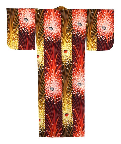 満開の花火のような菊花模様。黄と朱に分割され、一見すると縦に縫い合わせたように見える大胆な柄。