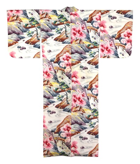 併用絣の技術で春の美しい景色をくっきりと織り込んでいる。遠目に見ると友禅のよう。