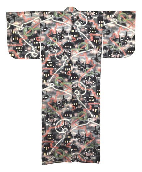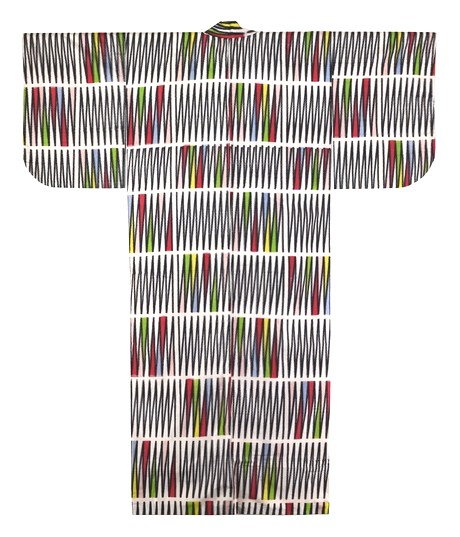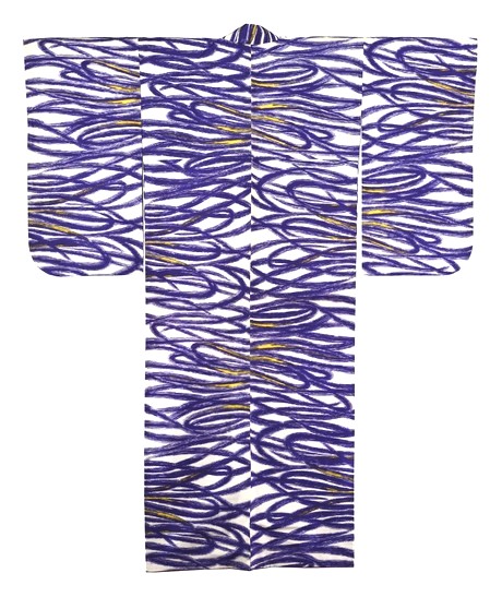 白地に紫と黄の線画で、大人っぽい抽象模様。フリーハンドの線が女性的で、色数をおさえてより印象的な銘仙。