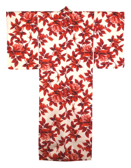 銘仙の柄の中でも人気のバラ柄。黒地に白・黄・赤・青の大輪のバラが表現されていて、ひときわ華やかで人目をひく柄。併用ならではの一品。