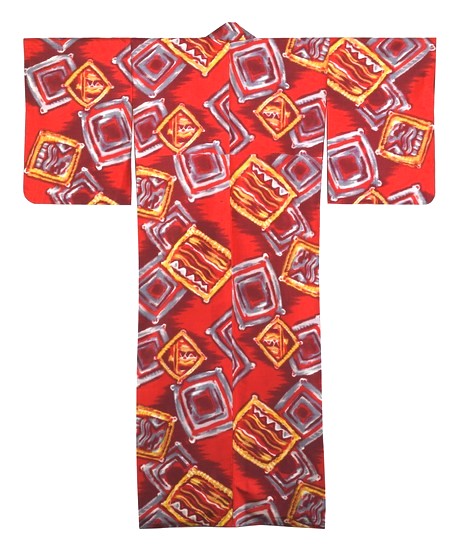 上部と側面から見た糸巻き器をデフォルメした、不思議な幾何学模様。身近にある生活道具を柄に生かした銘仙も多数あります。