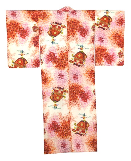 桜の花びらのような、ピンク、紅の霞の中に、御神輿が躍動する柄は、単衣仕立で初夏にふさわしい。