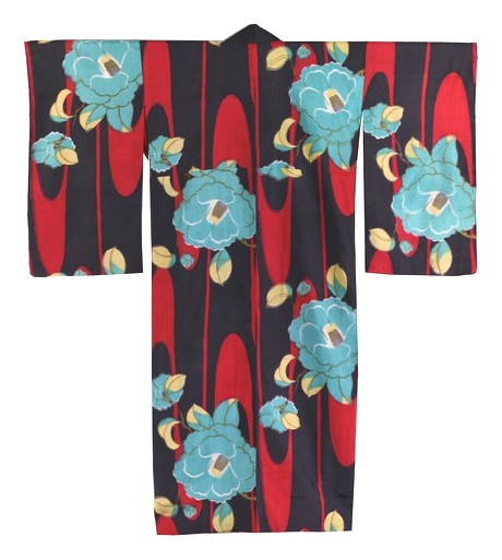 伝統柄「壷だれ」模様に、水色の大輪の椿花を配した柄は、大胆な、これぞ“伊勢崎銘仙”。